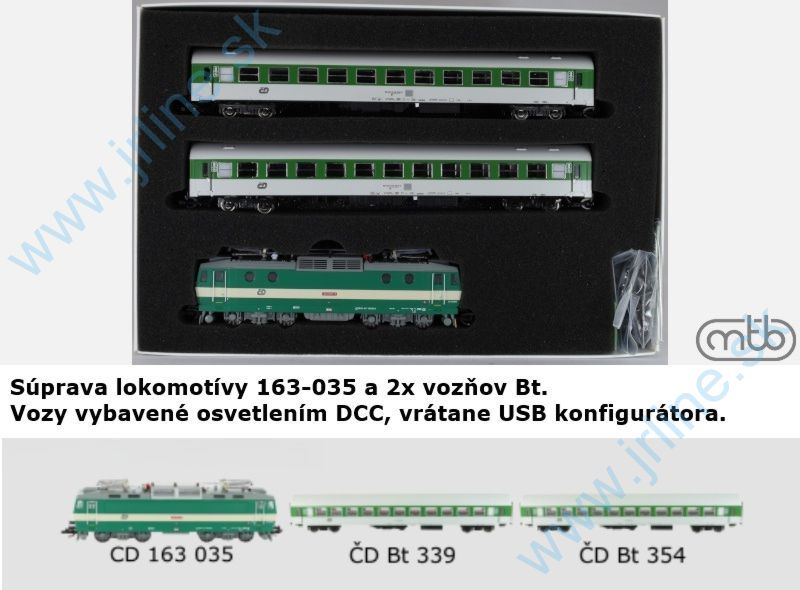 Železničná správa : ČDEpocha 5Délka 550 mmMin. poloměr oblouku 280 mmOsvětlení bílá/červenáDigital plux16Zvuk nePočet hnaných náprav 4Počet bandáž. náprav 0Spřáhlo NEM šachtaSúprava lokomotívy 163-035 a 2x vozňov Bt. Vozy vybavené osvetlením DCC, vrátane USB konfigurátora. Elektrická lokomotíva radu 163 (E499.3) bola vyrábaná v niekoľkých sériách v závode Škoda Plzeň v rokoch 1984 až 1992, celkovo 120 kusov + 60 modifikovaných kusov radu 162. Vznikla odstránením striedavého prúdu z lokomotívy 363. Lokomotíva s výkonom 4 000 kW a vybavená tyristorovým riadením je určená na ťahanie vlakov na tratiach s napätím 3 000 V DC a nahrádza sériu 140 a 141. Po rozdelení v roku 1992 sú lokomotívy univerzálne používané spoločnosťou ČD pre nákladnú aj osobnú dopravu, zatiaľ čo ŽSR ich používa len pre osobnú dopravu. Neskôr ČD pokračovala v rekonštrukcii série 162 na vyššie rýchlosti a ČD Cargo ich upravila na dvojitý systém série 363.5. Model s číslom 163-035 bude k dispozícii iba v sade;