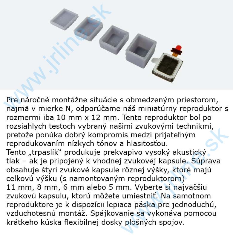 Pre náročné montážne situácie s obmedzeným priestorom, najmä v mierke N, odporúčame náš miniatúrny reproduktor s rozmermi iba 10 mm x 12 mm. Tento reproduktor bol po rozsiahlych testoch vybraný našimi zvukovými technikmi, pretože ponúka dobrý kompromis medzi prijateľným reprodukovaním nízkych tónov a hlasitosťou. Tento „trpaslík“ produkuje prekvapivo vysoký akustický tlak – ak je pripojený k vhodnej zvukovej kapsule. Súprava obsahuje štyri zvukové kapsule rôznej výšky, ktoré majú celkovú výšku (s namontovaným reproduktorom) 11 mm, 8 mm, 6 mm alebo 5 mm. Vyberte si najväčšiu zvukovú kapsulu, ktorú môžete umiestniť. Na samotnom reproduktore je k dispozícii lepiaca páska pre jednoduchú, vzduchotesnú montáž. Spájkovanie sa vykonáva pomocou krátkeho kúska ohybnej dosky.Translated with DeepL.com (free version)