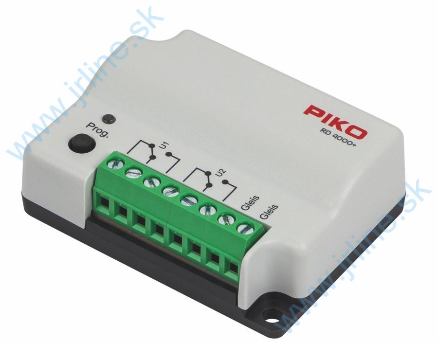 PIKO RD 4000+ pre elektrické spotrebiče Spínací dekodér na spínanie až 4 elektrických spotrebičov, ako sú svetelné signály, lampy, motory atď., prostredníctvom dvoch adries. Adresy (DCC 1 – 2048, Motorola® 1 – 320) je možné priradiť pomocou programovania tlačidiel alebo programovania CV. Programovanie CV je možné vykonať prostredníctvom výstupu programovacej koľaje centrálnej jednotky DCC alebo ako programovanie hlavnej koľaje pre doplnkové dekodéry. RD 4000+ zodpovedá aktuálnej norme RailCommunity RCN-213. Má dva bezpotenciálové prepínacie kontakty (prepínače), ktoré môžu prepínať externé napätia na až 4 ovládateľné spotrebiče. Maximálna prúdová zaťažiteľnosť kontaktov je 1 A.Nahrádza Artikel : 55031.